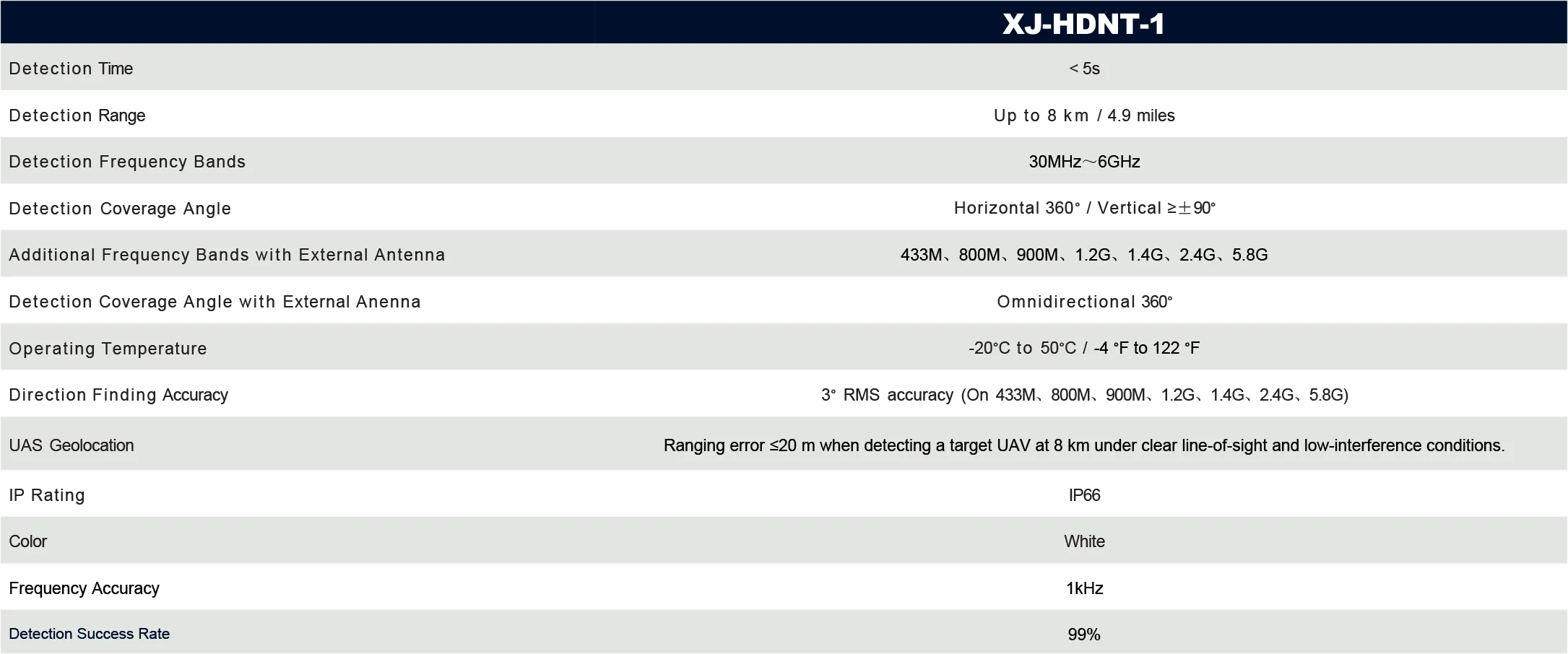 Ranging error ≤20 m when detecting a target UAV at 8 km under clear line-of-sight and low-interference conditions.
